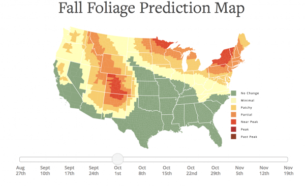 The map uses several million data point that include National Oceanic Atmospheric Administration’s historical and forecast temperatures and precipitation. It also takes into account historical leaf peak trends and peak observation trends.