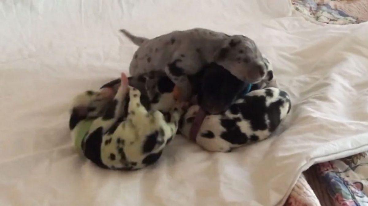 A Great Dane in Colorado gave birth to a litter of puppies and the owner was surprised to see most of the newborn dogs looking normal, but one of the precious creatures had green fur.
