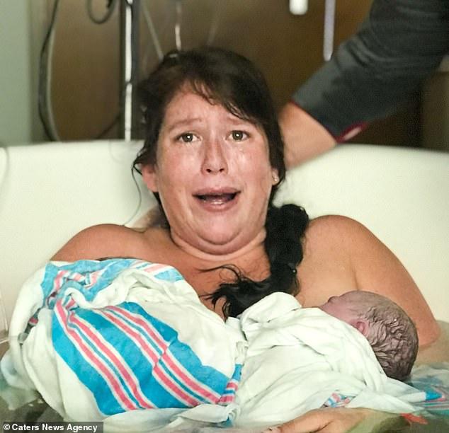 Lyndsey and her husband Wesley, 33, have shared photos of the big day and can be seen sitting open-mouthed in a birthing pool as midwives handed her a second child that nobody knew was coming.