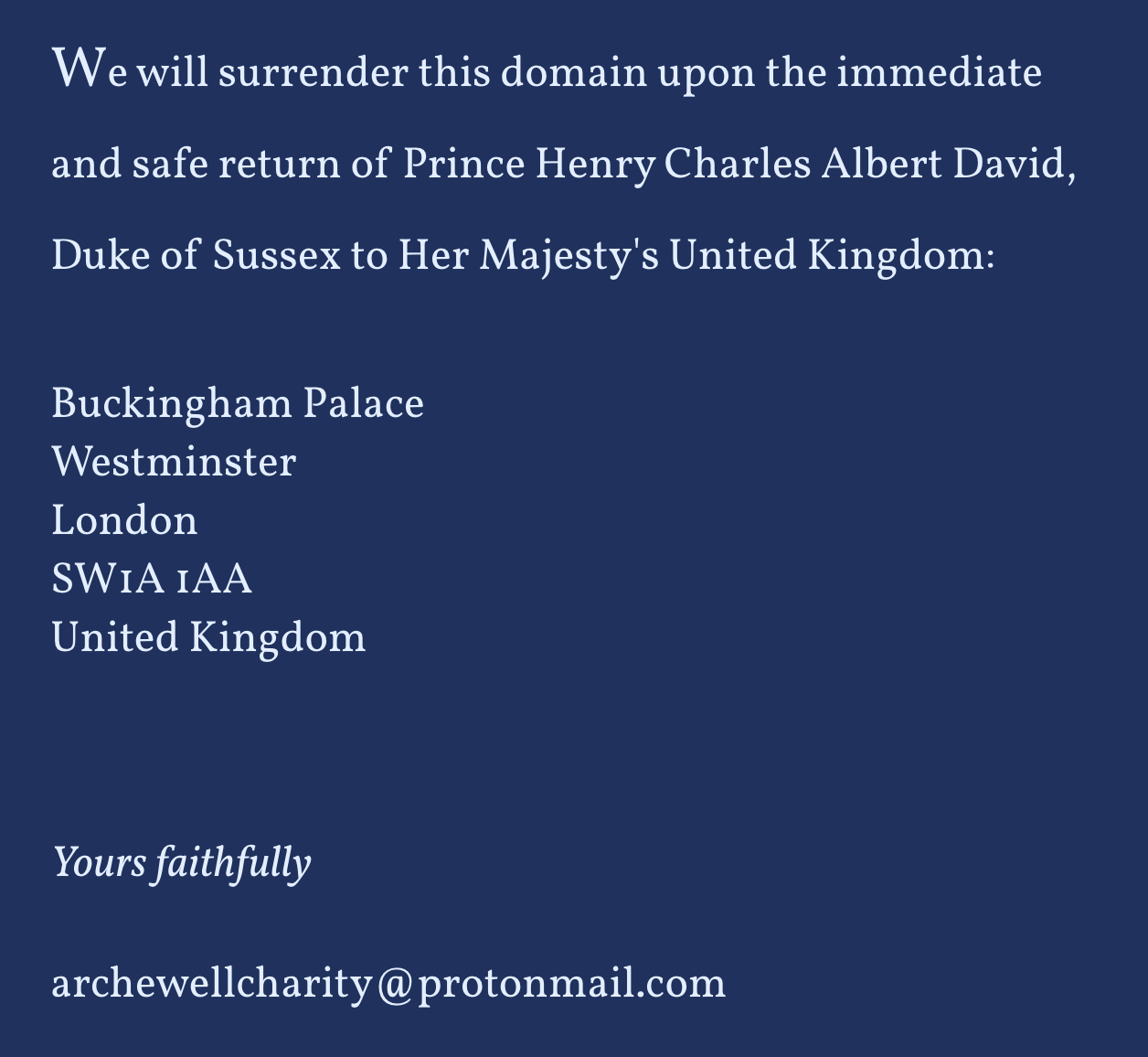It says, “We will surrender this domain upon the immediate and safe return of Prince Henry Charles Albert David, Duke of Sussex to Her Majesty’s United Kingdom.”