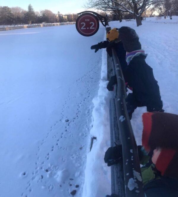 Unfortunately for Nico, he quickly learned that Bambi could not in fact fly, as the toy fell immediately in an area where the family could not retrieve it. Luckily, Bambi’s resting place was next to a distance marker sign, which made it easy for the family to find it again when they came back to visit in the coming days. Despite this, it was looking like Bambi would never be coming home, as it was too dangerous for them to get out on the frozen water to grab the toy.