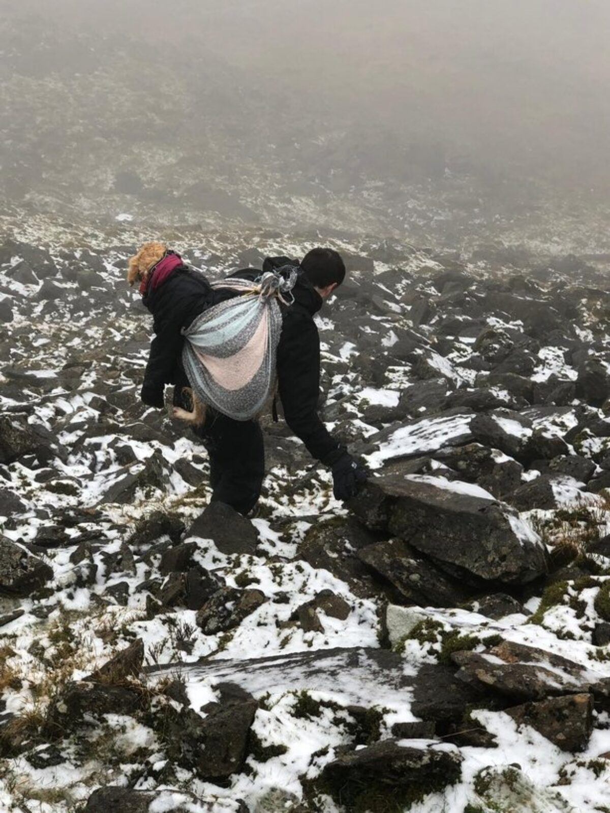 “Ciara put her on my back and we started going down the mountain, but it was very icy and rocky, so we fell a few times. Ciara came up with a good idea – she strapped her to my backpack. She used her scarf to make a little nest for her.”